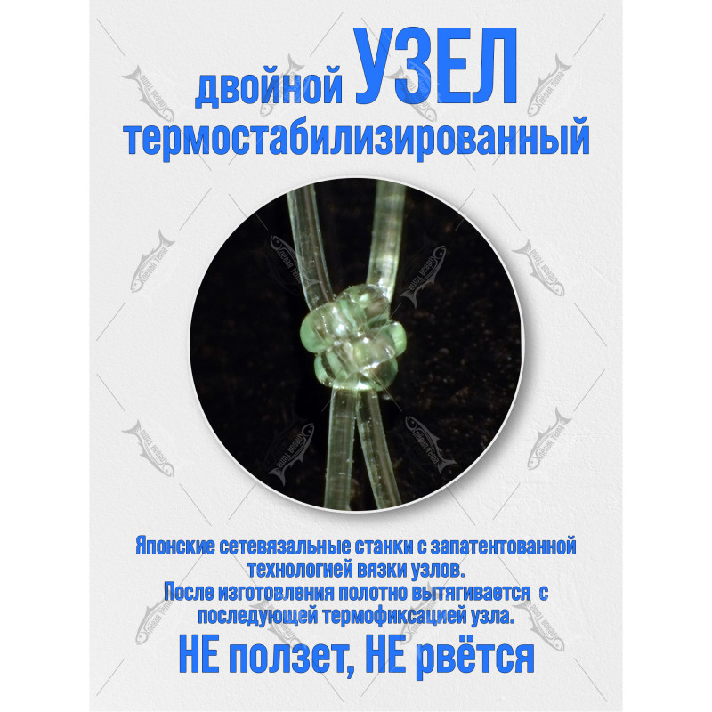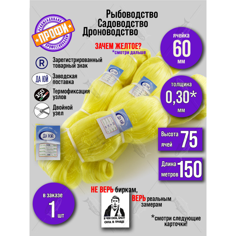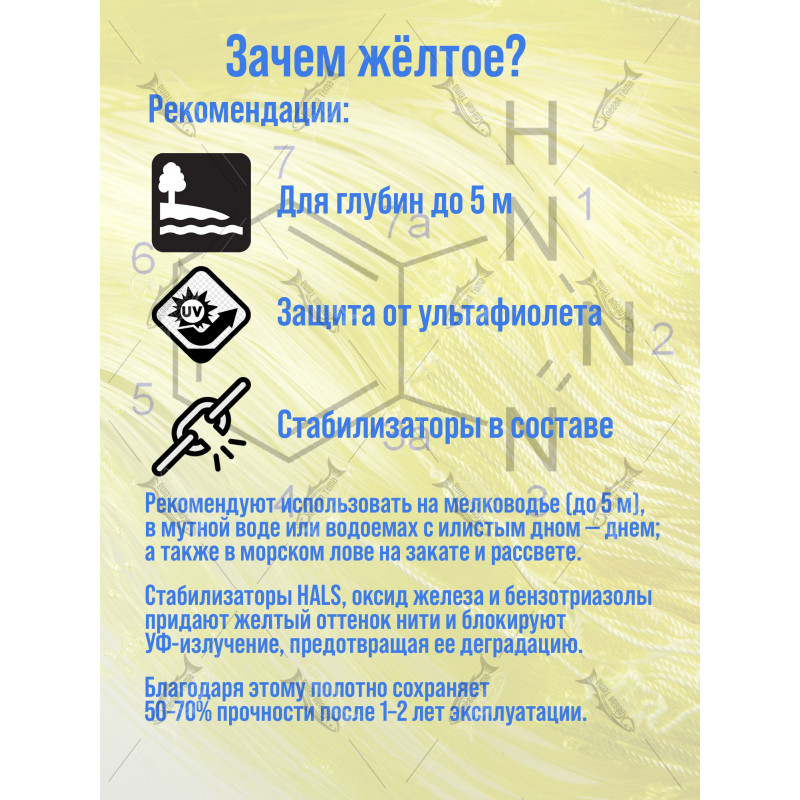 Наше сетеполотно из лески диаметром 0.30 мм — это оптимальный выбор для самостоятельного изготовления или ремонта рыболовных сетей, подсачеков, садков и других промысловых снастей. Ярко-желтый цвет обеспечивает невидимость в воде для рыбы и видимость контроля снасти и меньше пугает рыбу по сравнению с темными оттенками.