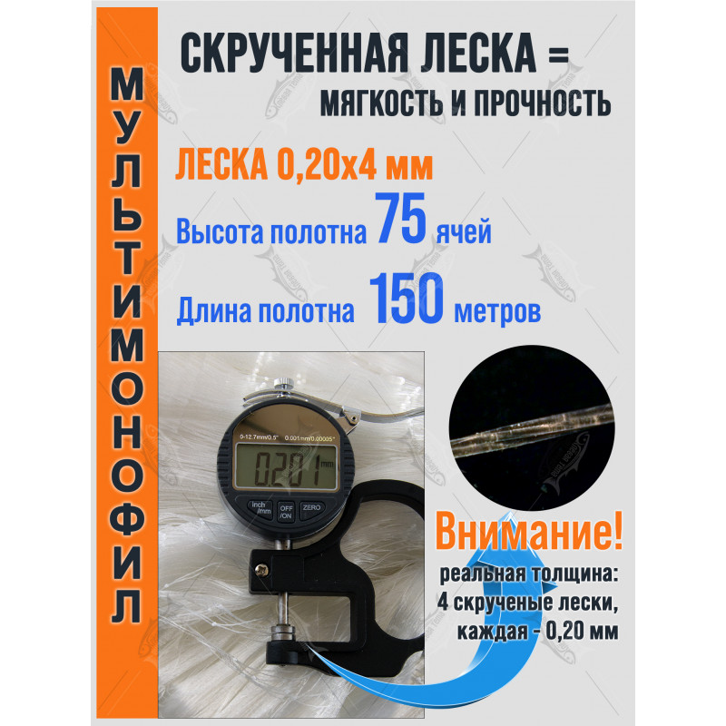 Структура нити 0,20×4 означает, что каждая нитка полотна — это жгут из четырёх мононитей диаметром 0,20 мм, скрученных вместе. Такая конструкция даёт мягкость и эластичность полотна, улучшает запутывание рыбы и увеличивает прочность по сравнению с одиночной леской аналогичного диаметра.