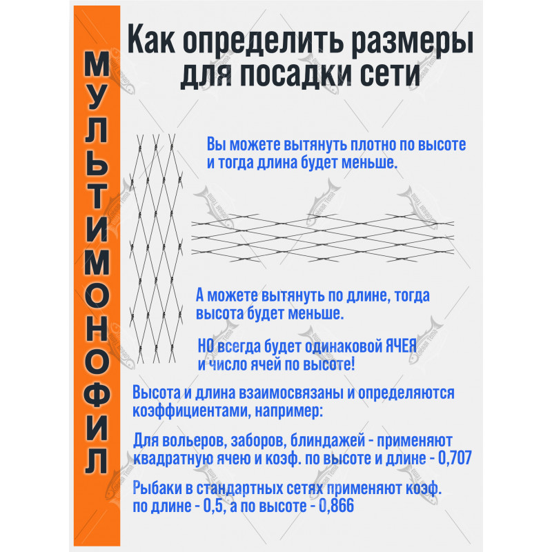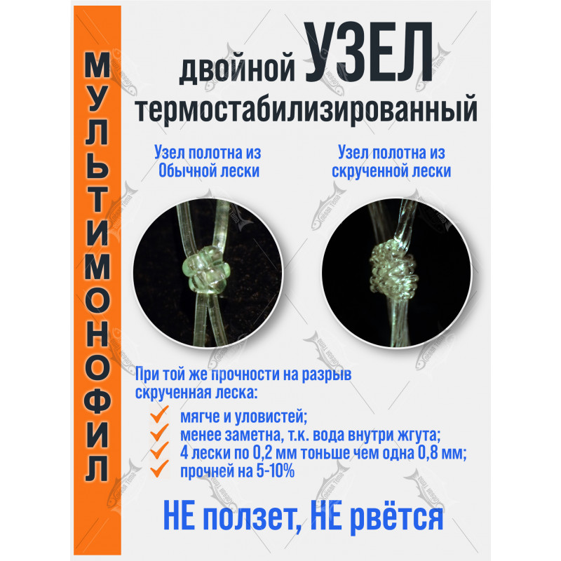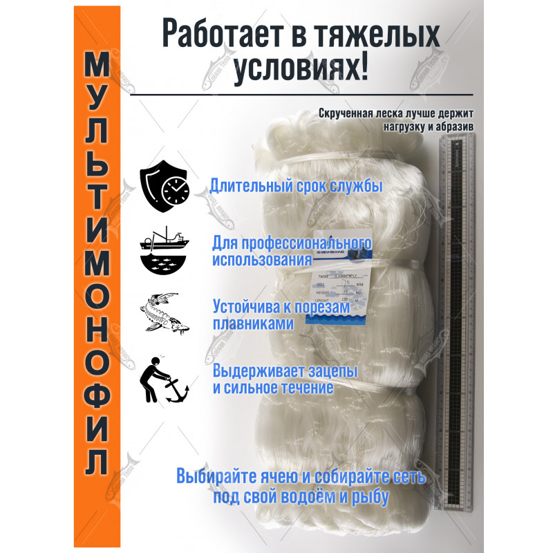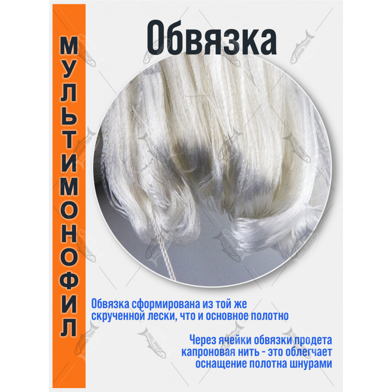 — это мультимонофиламентное белое полотно длиной 150 м и высотой 75 ячей для самостоятельной сборки рыболовных сетей. Белый цвет и тонкая леска делают полотно малозаметным в воде, что повышает уловистость на прозрачных и слабомутных водоёмах.