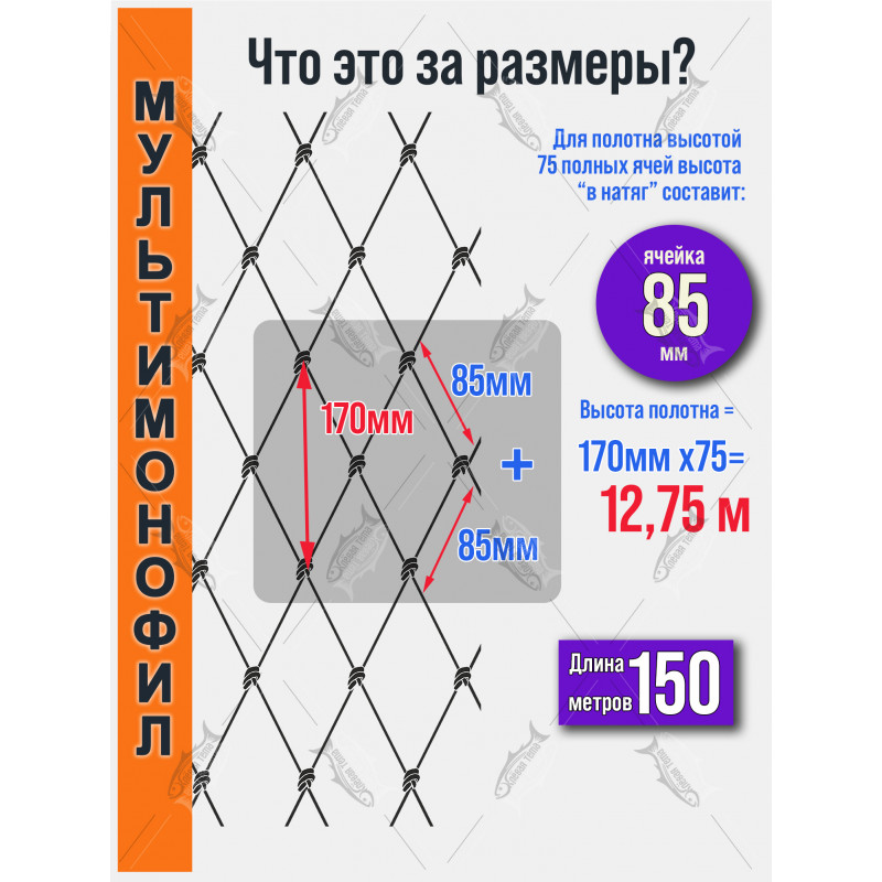 Ячейка 85 мм — универсальный размер для ловли щуки, судака, хорошего леща и другой средней и крупной рыбы на реках, озёрах и водохранилищах. Полотно подходит для изготовления ставных сетей и делей для любительской и полупромысловой рыбалки.